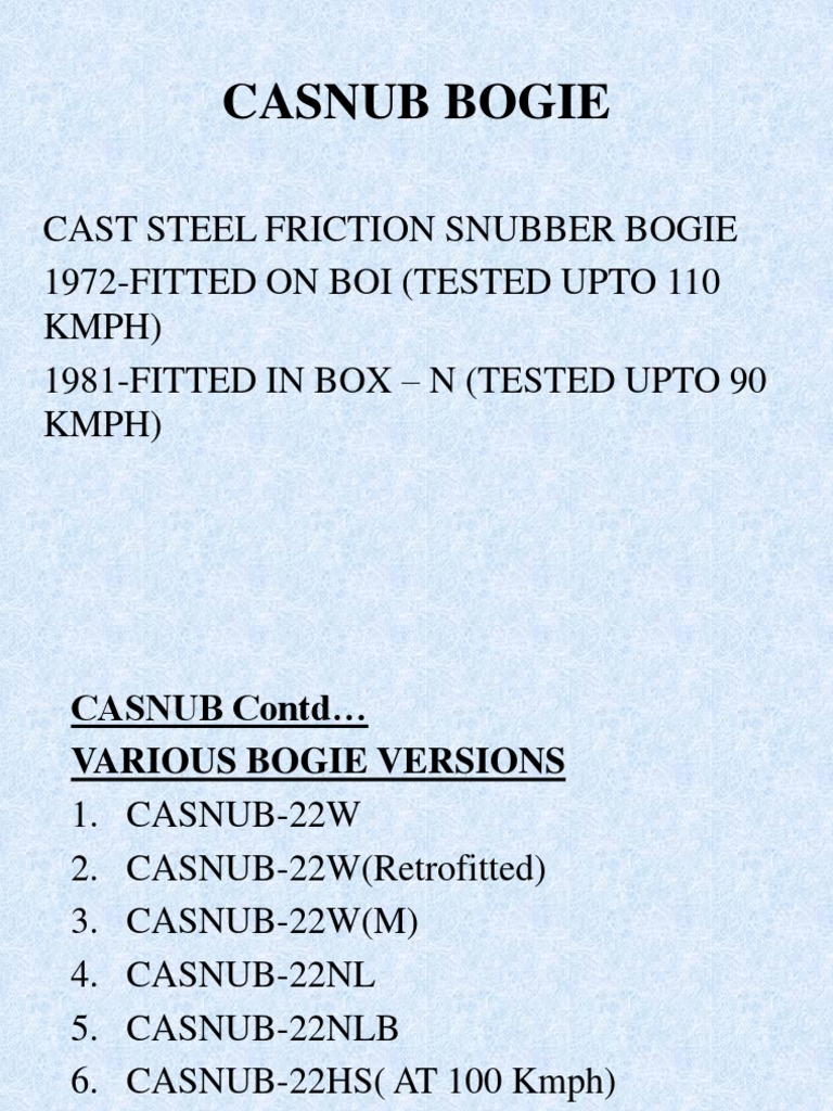 Casnub Bogies from img.pdfslide.net The bolster is supported on the side frame through groups of nested helical springs. Public sector unit will dispatch first of the four casnub bogies to amritsar on friday come august 6, a brand new chapter will be added to the industrial. The bolster is mostly same as nlb type except for outer gib opening and higher diameter spigot for the spring seat. A fabricated mild steel spring plank connects the side frames. Adapter, retainer bolt & side frame key assembly iii. The casnub bogie was first lesied in About press copyright contact us creators advertise developers terms privacy policy & safety how youtube works test new features press copyright contact us creators. The initial batch of casnub bogie was fitted with cylindrical rollerbearing axle box and matching wheel set.